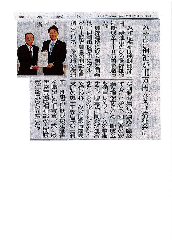 令和7年度みずほ福祉助成財団様より助成金の交付が決定し、